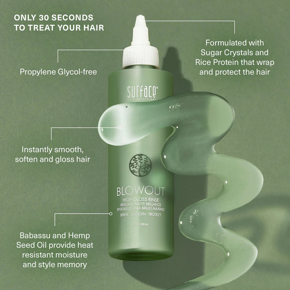 30-second treatment for a high-gloss finish. Instantly smooth, soften, and gloss hair for a glass-like blowout. Our natural, Propylene-glycol-free formulation includes Sugar Crystals and Rice Protein that wrap the hair while Babassu and Hemp Seed Oil provide heat-resistant moisture and style memory.