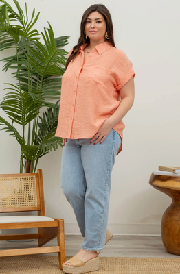 Curvy Peach Crinkle Cuff Button Down