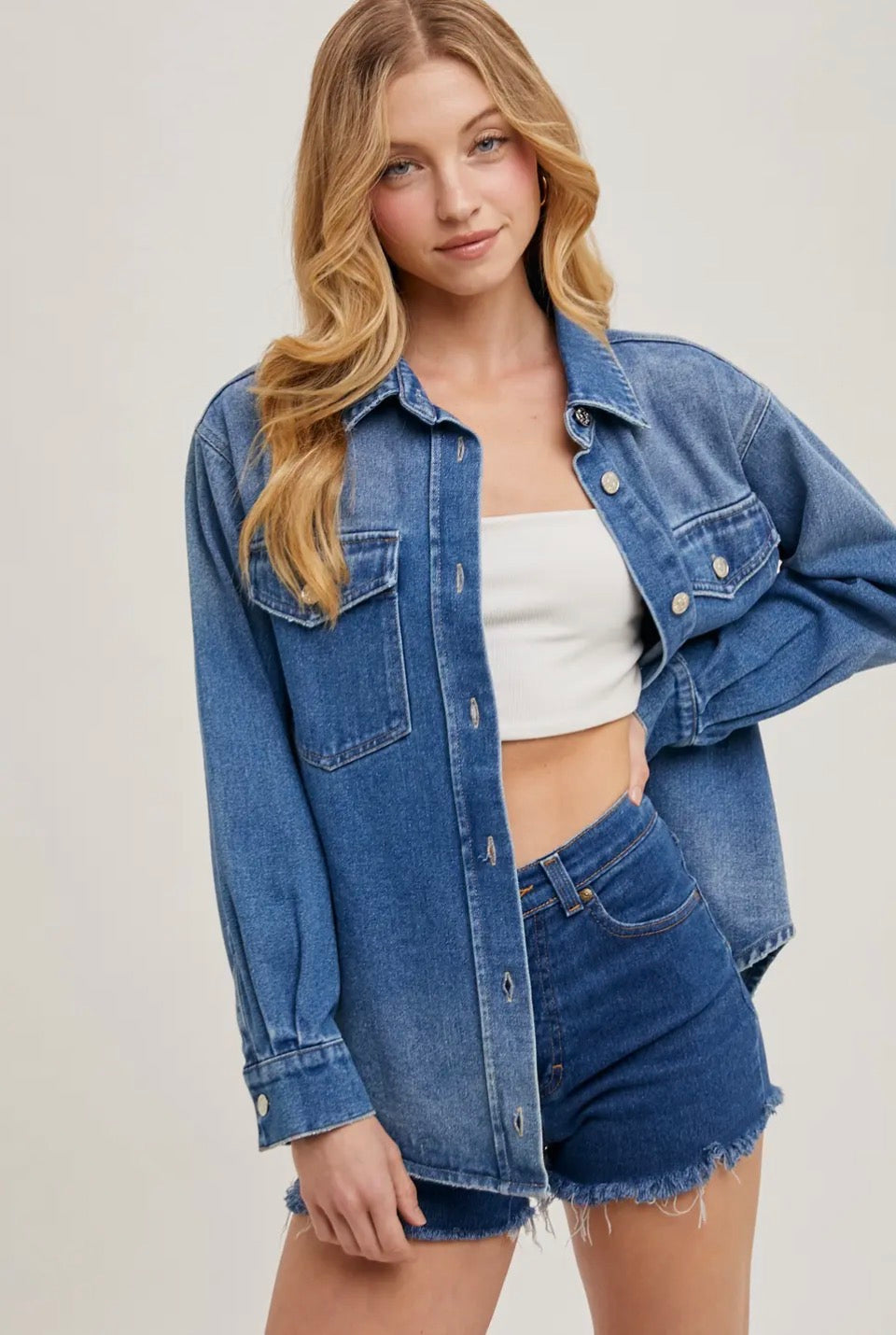 The Denim Shacket is the perfect blend of a shirt and jacket, offering effortless style and everyday versatility. Crafted from durable yet comfortable denim, this shacket features a relaxed fit ideal for layering in any season. Whether worn open or buttoned up, the Denim Shacket pairs seamlessly with tees, sweaters, or dresses, making it a must-have staple for casual, on-trend looks.
