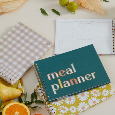 • 8.5" x 6.5" • 60 Sheets • Weekly Meal Planner Interior • Perforated Market List • Kitchen Conversion Cheat Sheet • Pocket • Gold Twin Wire Spiral • Printed with Soy-Based Inks on 100 GSM Uncoated Woodfree, Acid-Free Paper