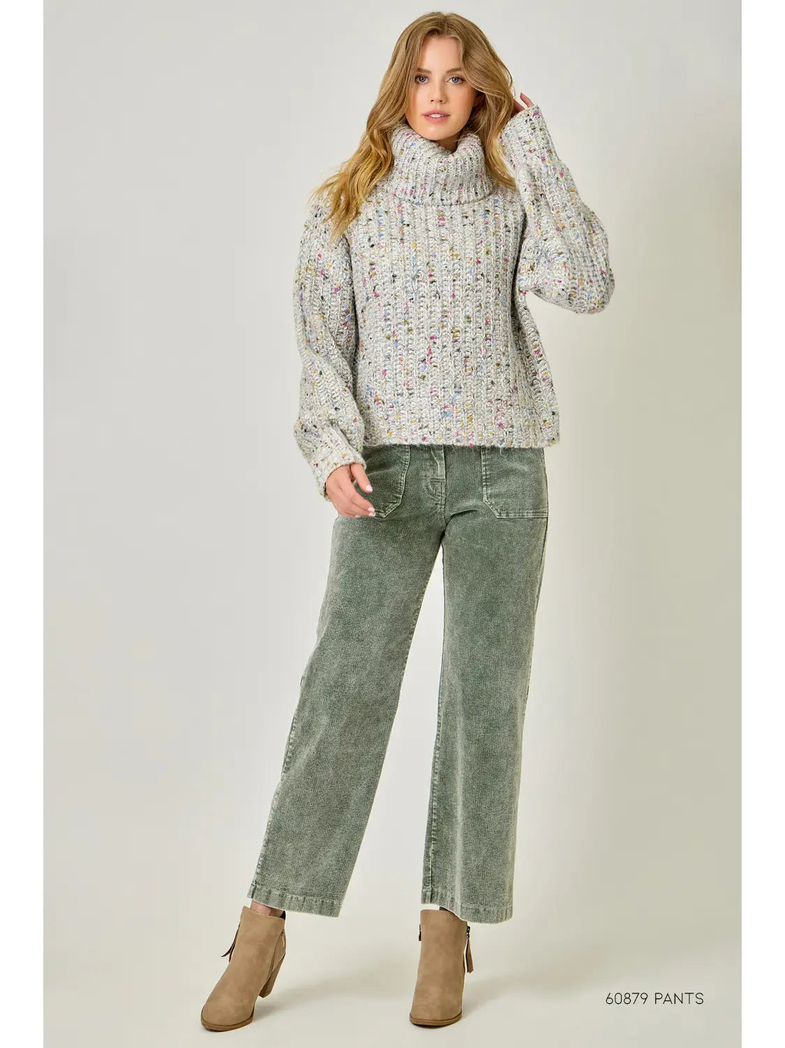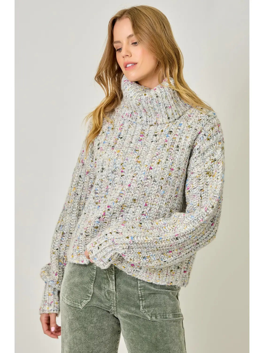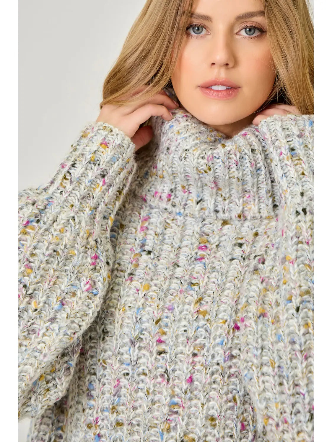 Add cozy, colorful style to your wardrobe with this turtleneck mixed yarn sweater. Featuring a vibrant, multicolored yarn throughout, long bubble sleeves, and a relaxed, loose fit, this sweater combines comfort with a playful, eye-catching design. Perfect for layering or wearing on its own, it’s an effortless statement piece for casual, everyday wear. Model is 5'9" and wearing a size Small.