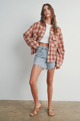 The Red Plaid Shirt Jacket is a cozy and versatile layering piece that blends classic plaid style with everyday comfort. Featuring a bold red plaid pattern and a relaxed shirt-jacket silhouette, this piece is perfect for transitional weather and casual outfits. Easy to layer over tees or sweaters, the Red Plaid Shirt Jacket adds warmth, style, and timeless appeal to your fall and winter wardrobe.