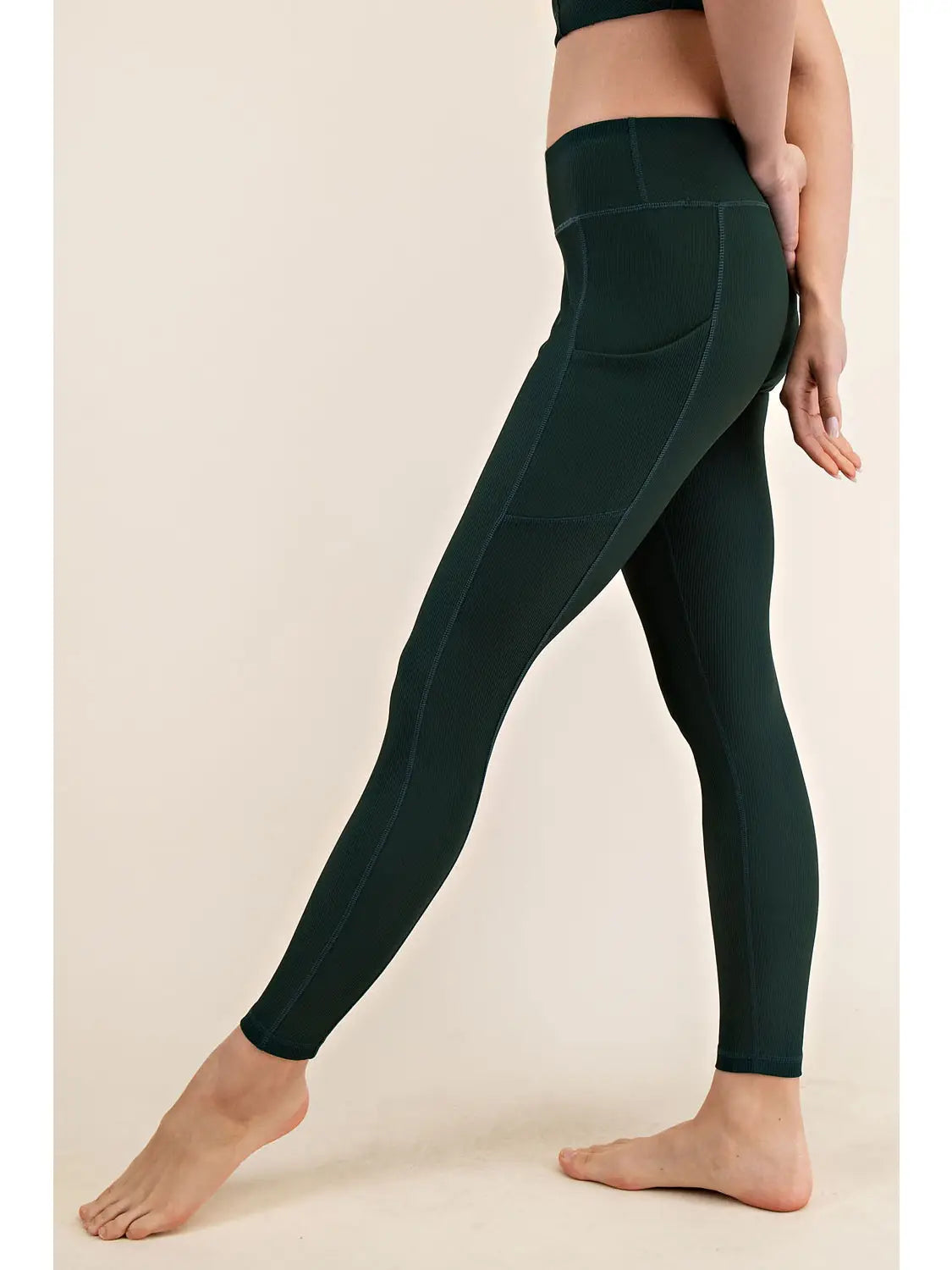 Elevate your activewear wardrobe with these Regency Green ribbed leggings, crafted from a stretchy 2x2 nylon rib blend for comfort and support. Featuring a flattering full-length fit, yoga-ready stretch, and convenient side pockets, these leggings are ideal for workouts, yoga sessions, or everyday casual wear. Designed for a sleek, body-hugging silhouette, the Regency Green ribbed leggings combine style, functionality, and all-day comfort. Model is 5'9" and wearing a size Small.