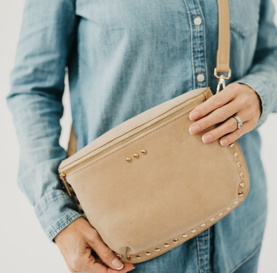 Meet the Sabrina Studded Vegan Suede Bum Bag your new go-to accessory! This playful pack combines buttery soft vegan/faux suede with eye-catching gold rivet details for a look that's equal parts chic and edgy. Choose from four stunning colors to match your vibe, and stay organized with smart interior pockets. Perfect for hands-free adventures, whether you're hitting the town or running errands. Elevate your everyday carry game!