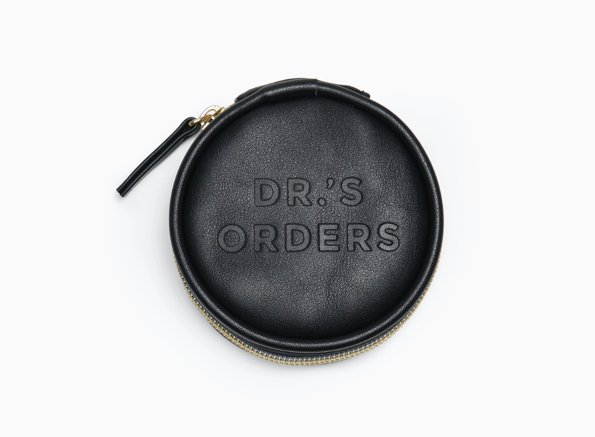 • 3.6" diam x 1" depth • Vegan Leather Kit • Printed Fabric Liner • Removable Colorful Tassels • Metallic Zipper Closure • Seven Compartment Pill Box